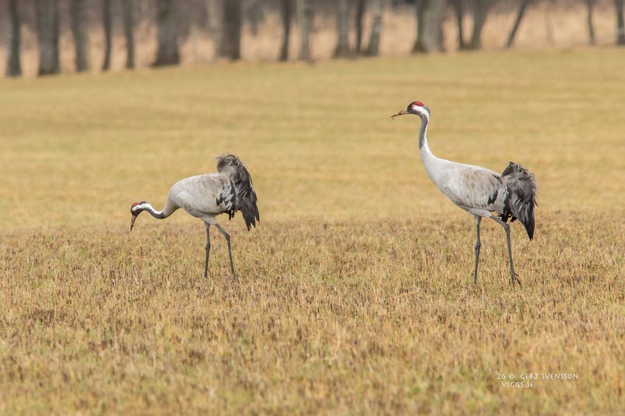 Kinder, nacke och hals är svarta, huvudets sidor bakom ögonen och på överhalsen vitaktiga. På hjässan har den en fjäderlös röd vårtaktig hudfläck som tranan varierar i färgintensitet och storlek med hjälp av sin kraftiga nackmuskel. Vingpennorna är svarta. De inre förlängda armpennorna har upplösta, krusiga fan, vilka bildar en krusig stjärtliknade fjäderbuske. Tranans egentliga stjärt är istället ganska kort.