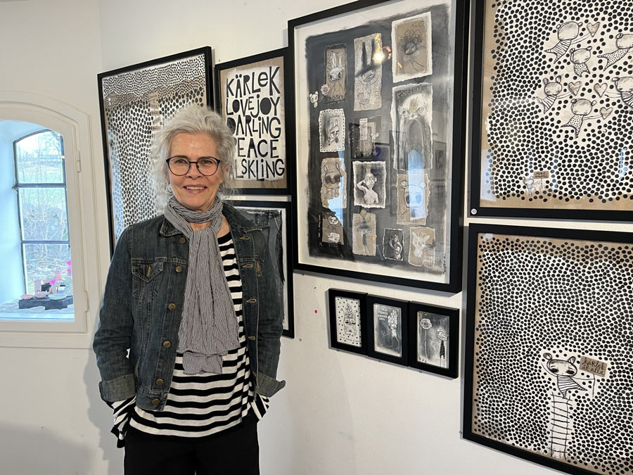 Lotta Hallin kommer från en konstnärsfamilj och är helt autodidakt. Hon har arbetat som formgivare och designer i hela sitt liv, men det var först efter pandemin som hon fick tid för att ägna sig åt sin egen konst. Lotta hämtar inspiration av allt som sker omkring henne, både i den lilla och den stora världen. Hon jobbar med akvarellfärger och pastellkritor i olika collage. För en tid sedan gick hon även en keramikkurs på Paus Studio i Osby, något som hon tycker var mycket givande.