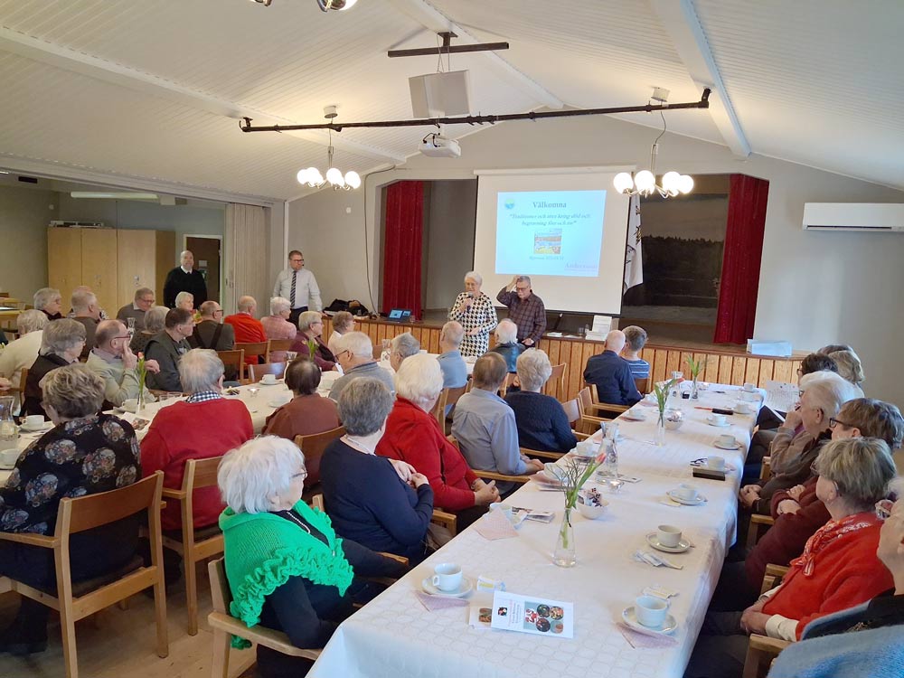 Dags för eftermiddagens huvudpersoner från Anderssons begravningsbyrå att ta sig an detta allvarliga men väldigt viktiga ämne. Vi fick en respektful och saklig information om vad som händer när en människa dör. Det dör ca. 90000 personer om året i vårt land. Daniel inledde med en historik och det har ändrats en hel del sedan 1800-talets begravningar då det var hela byns angelägenhet till idag då många begravningar sker inom familjen. Vi fick i ord och bild följa med på en resa genom mer än ett århundrade. Det går allt länger mellan dödsfall och jordfästning nu än förr. Kremering har blivit vanligare. Borgliga begravningar har ökat. Daniel informerade också om de olika möjligheterna att välja en personlig ceremoni allt från annons till val av kista, blommor, minnesstund m.m. Man kan skriva ner sina önskemål Livsarkivet/Vita arkivet. Vi fick svar på många viktiga frågor.