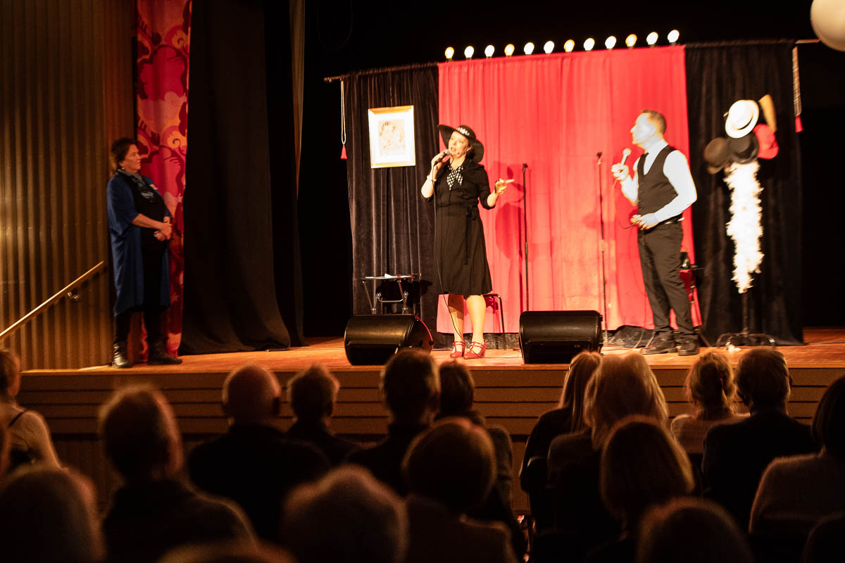 Teaterföreningens ordförande Birgitte Leger tackade för en föreställning med musik, humor och teater.
