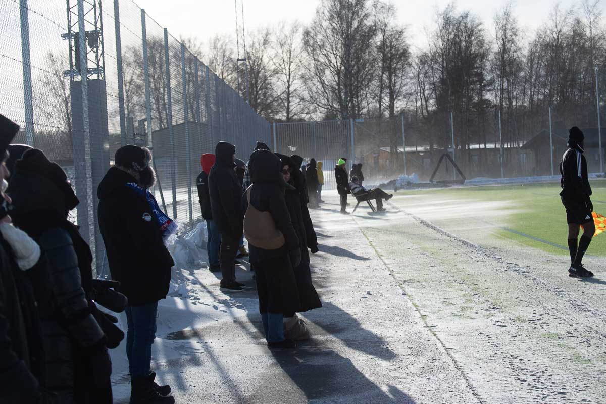 Trots 2-3 minusrader och byig vind fanns ett femtiotal supporters, väl ”påpälsade”, på plats på alltid blåsiga Österås. Kyleffekten gjorde att den upplevda kylan kändes som cirka -10.