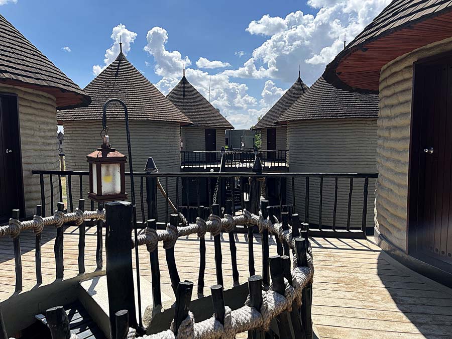 På Salt Lick Safari Lodge bodde vi i runda små hus som vilade uppe på pålar så att de vilda djuren kunde vandra under husen och gick att se från landgångarna mellan dessa.