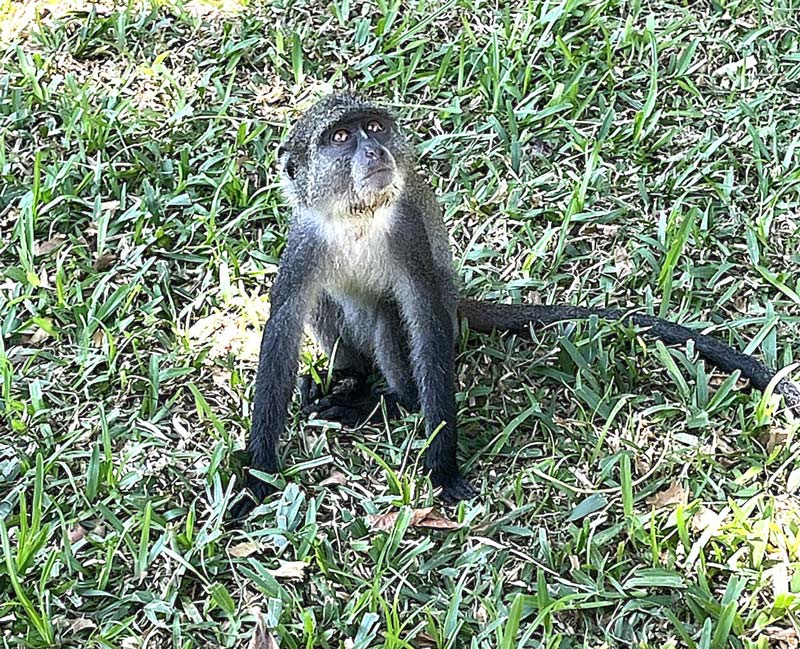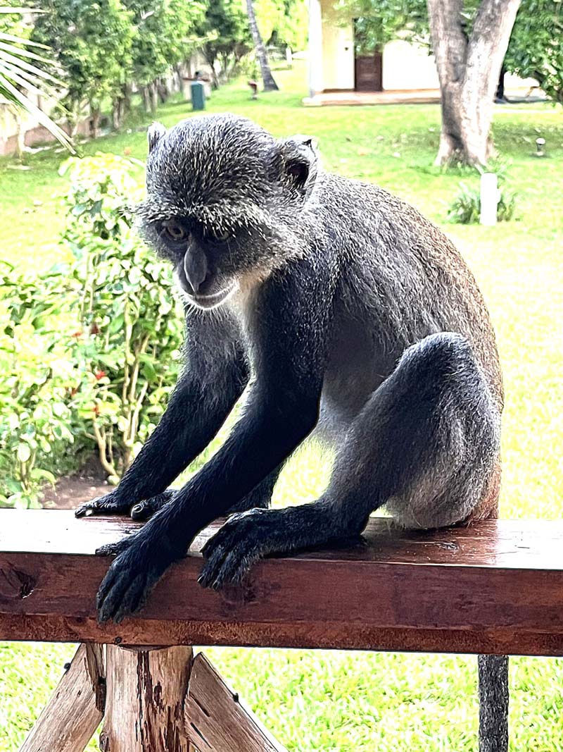 Förutom vi turister bodde det också en mängd apor på lodgerna på gott och ont. De var väldigt söta att se på, särskilt när de minsta lekte runt i gräset, men de kunde också vara besvärliga. De var otroligt nyfikna och framfusiga. Det gick inte att lägga någon frukt eller annat ätbart ifrån sig utomhus, då var där genast en liten apa och nappade åt sig det.