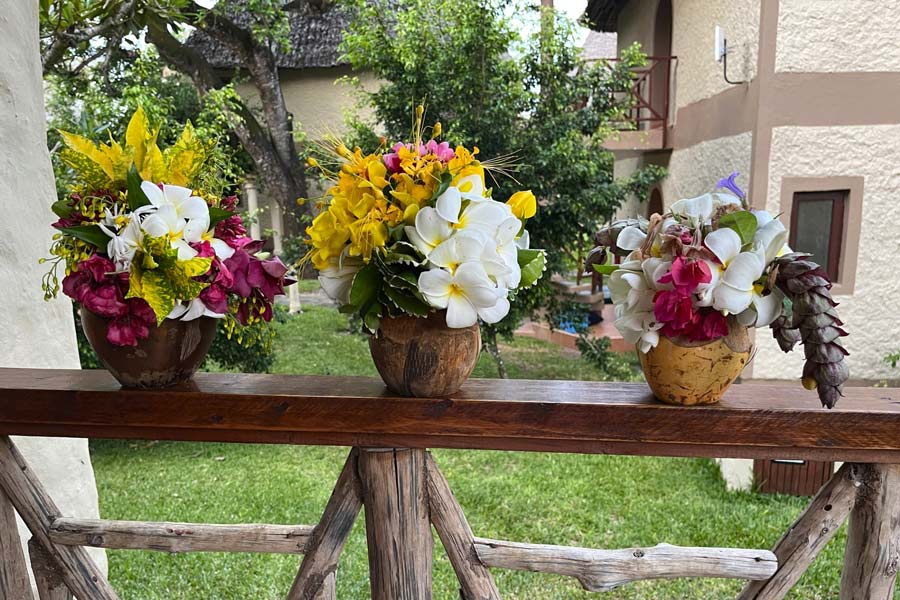 Varje dag fick vi vackra blomsteruppsättningar av trädgårdsmästaren på den lyxiga lodgen på Diani beach.