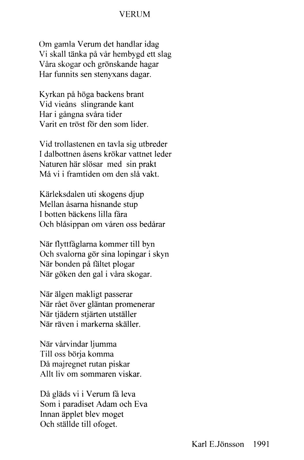 VERUM. En av de mest aktiva Verumiterna som jag minns från min uppväxt var Karl E Jönsson. Han startade Verums pensionärsförening (numera SPF) 1969 och var i många år bygdens rörmokare som åkte omkring med sin T-Ford full av reservdelar till befolkningens vattenanläggningar.