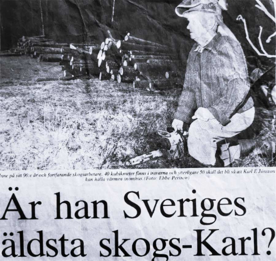 Men Karl Edvin Jönsson var egentligen småbrukare och skogsägare på Verum nr 3 vid vägen mot Norreskog. Eftersom hans far ”Täckare Jösse” var känd som duktig taktäckare fick även sonen ibland finna sig i att kallas ”Täckare-Karlen”. Vid 90 års ålder blev Karl Jönsson i Norra Skåne kallad ”Sveriges äldsta skogskarl”. Han skrev även fina dikter om den bygd där han tillbringare hela livet. I Göingebladet 1987 (nr 1) publicerades Karl E. Jönssons dikt ”Göingevisan” avsedd att sjungas på melodin ”Skånska Slott och Herresäten” och den börjar med: Om Göinges vackra natur vi vill sjunga, det ska vi göra båd´ gamla och unga.