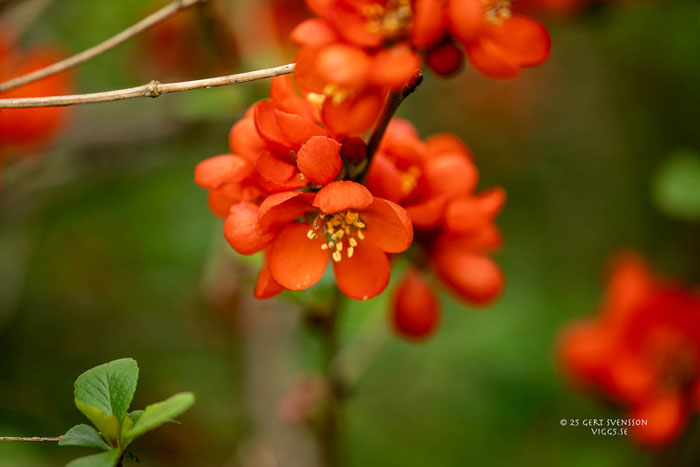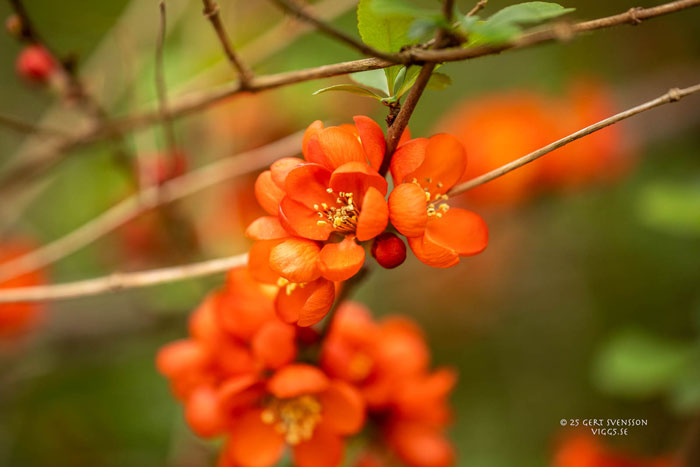 Blommorna kommer flera tillsammans längs grenarna. Foderbladen är fem, hårlösa, hela, upprätta, de faller efter blomningen. Kronbladen är fem. Ståndarna är många till antalet. Fruktämne med 5 karpeller och fem fria pistiller. Frukterna är skaftlösa och svåra att lossa från frukveden. Fruktskalet är ljusgult till ljusbrunt och frukterna sitter kvar till långt in på senhösten eller vintern.