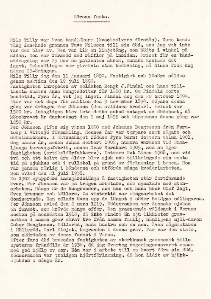 När vi besökte gården ”Pärsas" där han härstammade ifrån fick vi bifogade historia av Ivar Persson som skrivit ner vad han visste om Nils och gården. Min farfar, Carl, blev utackorderad på bygden när Nils dog. Så småningom kom han till Landskrona.