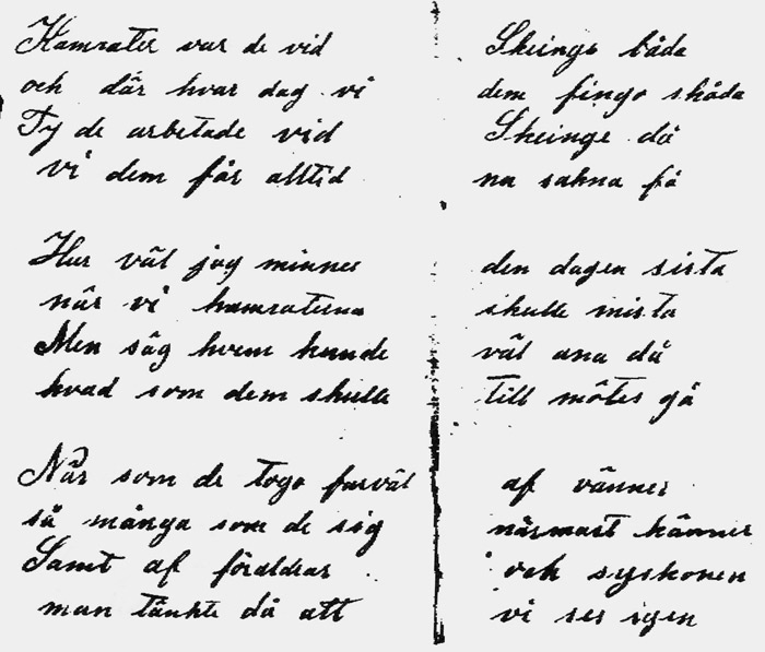 En rörande vers i visan lyder (se bild): Hur väl jag minnes den dagen sista, när vi kamraterna skulle mista. Men säg hvem kunde väl ana då, hvad som dem skulle till mötes gå.
