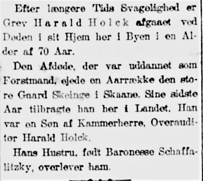 Notis om greven Harald Holcks död i tidningen København den 4 mars 1919