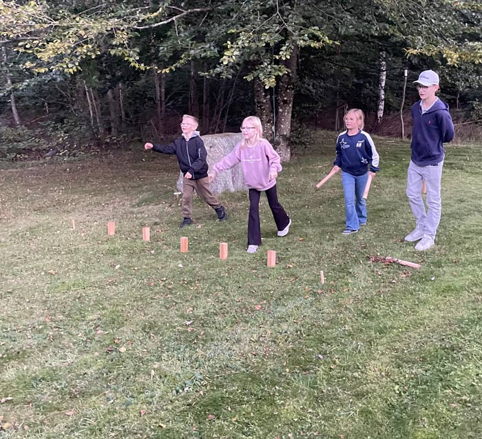 Efter detta var det dags för kubbspel. Maria Wilhemsson, en av de vuxna, höll i tävlingsreglerna för kvällen, och det blev spännande dueller mellan lagen. Det visade sig också att Maria var en mycket duktig grillmästare, så det dröjde inte länge förrän det var dags för korv med bröd samt saft.