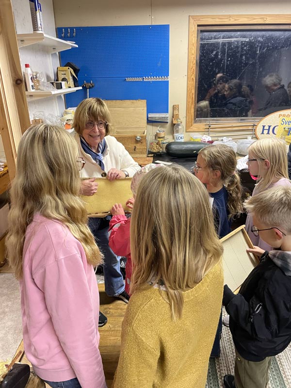 Först samlades tiotalet barn och ungdomar plus några vuxna runt bikuporna. Karin berättade bland annat att hon tagit bort honung från bina och att de har fått sockerlag i stället.