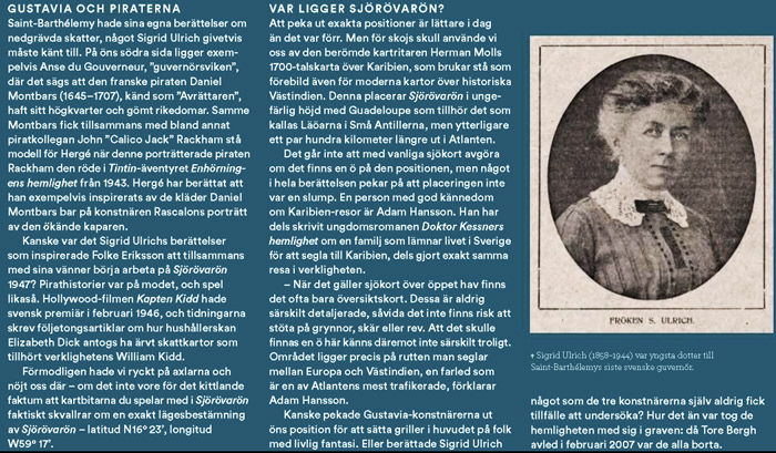 På ett uppslag i Boken om Alga presenteras fröken Sigrid Ulrich och den historiska bakgrunden till spelet Sjörövarön, som konstruerades 1955 av spelutvecklaren Folke Eriksson. Han var en. svensk tecknare, grafiker, skulptör, porträttmålare och uppfinnare. Pärlspelet gav honom guldmedalj för nytt spelsystem vid den internationella uppfinnarmässan i Bryssel 1970.