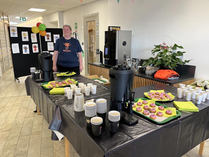 Margareta Tillström delade ut tablettaskar med Myntas egna små pastiller.