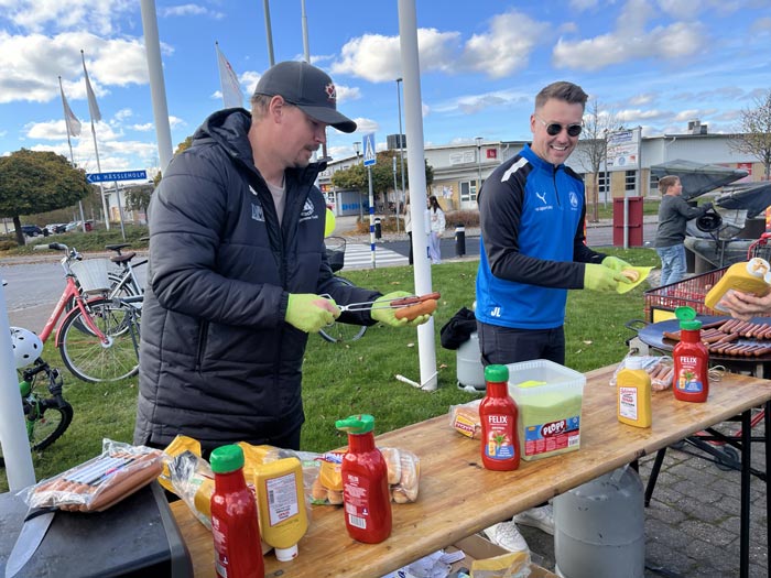 Både grillad korv med bröd och kaffe eller saft med en liten kaka till fanns som förtäring.
