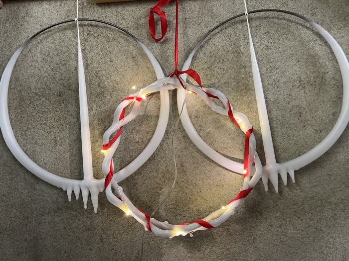 Ljus i ring här utan dekoration men de kommer säkert att kläs in med lingonris eller något annat som kan passa samt i röda band. Hänga upp i fönstret eller varför inte som i den andra som är gjord som en snodd krans flätad med en tunn ljusslinga i och med rött band. Passar bra till att hänga på ytterdörren, även denna kan passa fint med lingonris. Allt efter tycke och smak, det är bara att välja tema.