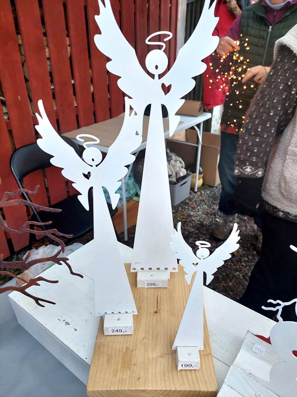 Änglar i plåt, vackra blomsterkransar, dörrdekorationer, korv, sill och ål.
