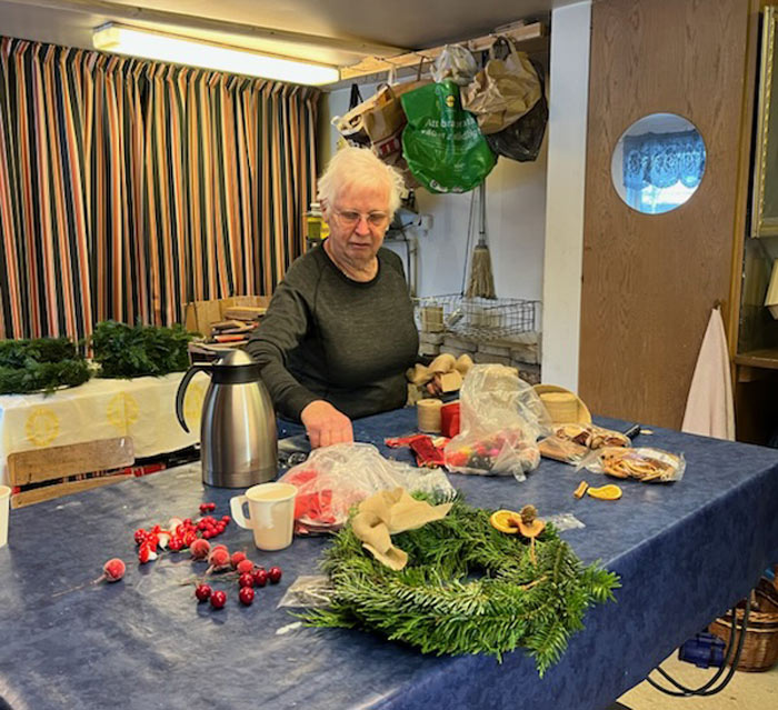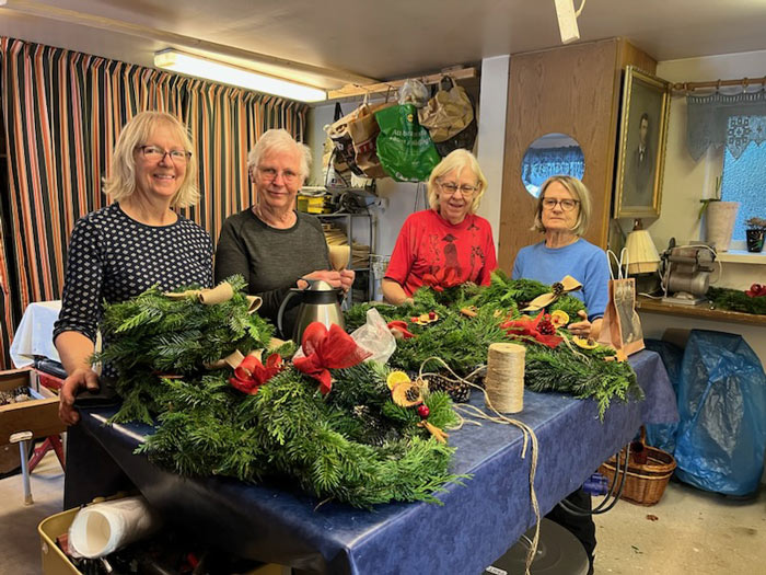 Inga Petersson, Ulla Stridsberg, Kerstin Tillström och Agneta Dahl samlades hemma hos Karin Svensson i Farstorp för att gemensamt tillverka de speciella kransarna. Kvintetten jobbade hårt och under god stämning, timme efter timme. Glada vinnare tog med tacksamhet emot de lokalt producerade julsakerna.