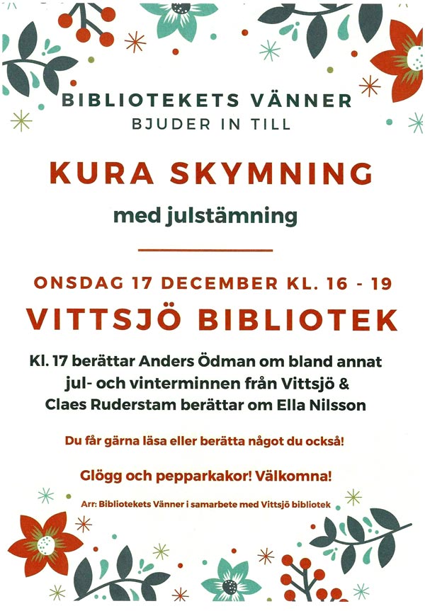 Biblioteket öppnar för glögg och pepparkakor och gemenskap kl 16 för att därefter starta berättarafton med att Anders Ödman som berättar om Jul- och vinterminnen från Vittsjö. Därefter kommer Claes Ruderstam att berätta om Ella Nilsson.