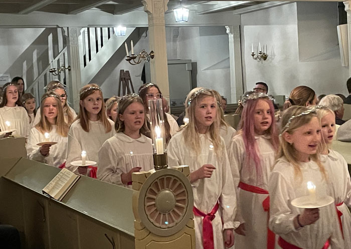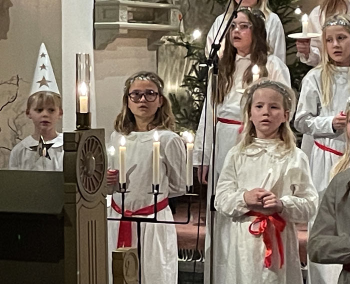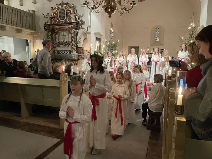 Tack till Verums bygdelag som hade tänt dessa. Kyrkan var nästan fullsatt när ungdomskörer från Vittsjö med två Lucior, Malva och Astrid, tjugo tärnor och en stjärngosse tågade in sjungandes Luciasången, under ledning av Marie Lind och Mats Lunnergård.