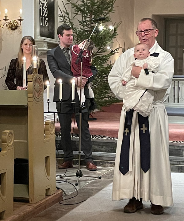 Kyrkoherden Christer Frostensson läste en text om överflöd och att vi skulle dela med oss till de som saknar något. Liksom att vi inte ska tro på män från Öster och Väster. Innan barndopet sjöngs psalm 248 Tryggare kan ingen vara.