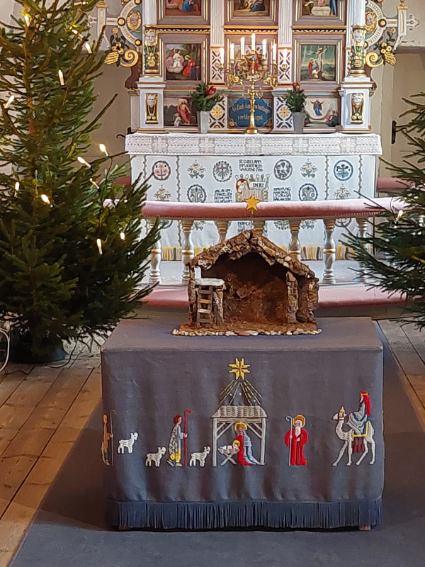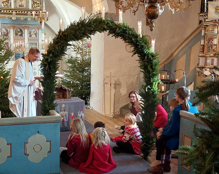 Barnen kunde under ledning av Sven hela berättelsen om Betlehem, skattskrivning, stallet, herdarna och Jesu födelse. Så pedagogiskt, lugnt och avslappnat fick alla kyrkans besökare följa berättelsen. In emellan sjöngs unisont Psalmerna 115 ” O Betlehem du lilla stad”, 114 ”Stilla Natt ”och 134 ”Gläns över sjö och strand ” med flera.