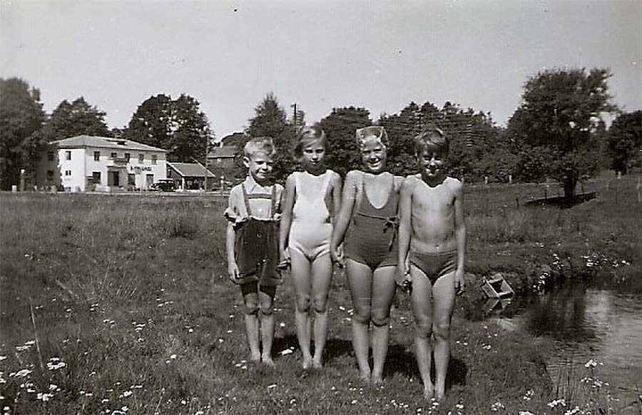 De fyra badnymferna som kan stiga i vattnet från en snickrad trappa är fr.v. Kennert Andersson, sommarflickan Lena Zederin från Göteborg samt syskonen Viveca och Bo Persson. I bakgrunden ses Björveruds Eftr, ålderdomshemmet och hållplatsen för bussarna.