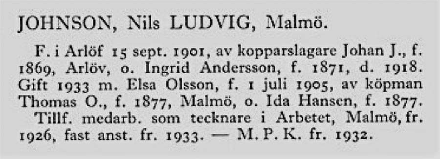 Konstnärens karriär har sammanfattats med dessa ord: Nils Ludvig Johnson, född 15 september 1901 i Arlöv, död 23 augusti 1996 i Skanör, var en svensk konstnär och tecknare. Johnson studerade vid Skånska målarskolan i Malmö, i Paris och Italien 1938–1939 samt under studieresor till England. Separat ställde han ut på SDS-hallen i Malmö 1955 och medverkade i Skånes konstförenings utställningar sedan 1933. Hans konst består av figurmotiv, gatuscener, stadspartier, landskap i akvarell och tusch. Han medarbetade i tidningen Arbetet som reportage och illustrationstecknare under signaturerna Ludvig, Ludwig och Ludville. Han är mest känd för att 1935 utgivit albumet Basker-Ville. Ludvig utförde även en samling med nio akvareller i samband med Kristianstads 350-årsjubileum 1964.