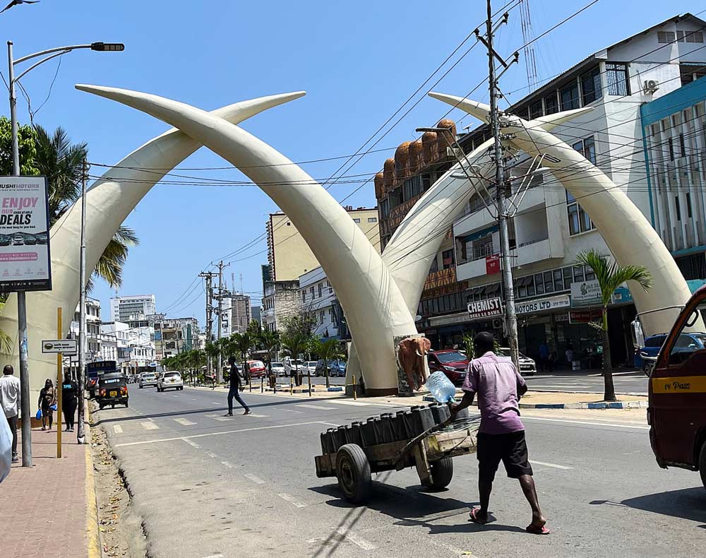 Det mest kända landmärket i Mombasa är det så kallade ”Mombasa Tusks”. Det är fyra jättelika elefantbetar i aluminium som sträcker sig över Moi Avenue i stadens centrum och bildar bokstaven M. Detta monument restes 1952, ursprungligen för att fira Storbritanniens prinsessan Elizabeths (senare drottning Elizabeth II) besök i staden och placerades längs den väg hon skulle färdas. Kenya var nämligen en brittisk koloni 1895-1963. Monumentet är en symbol för Mombasa och ska representera Mombasas rika djurliv, särskilt elefanterna.