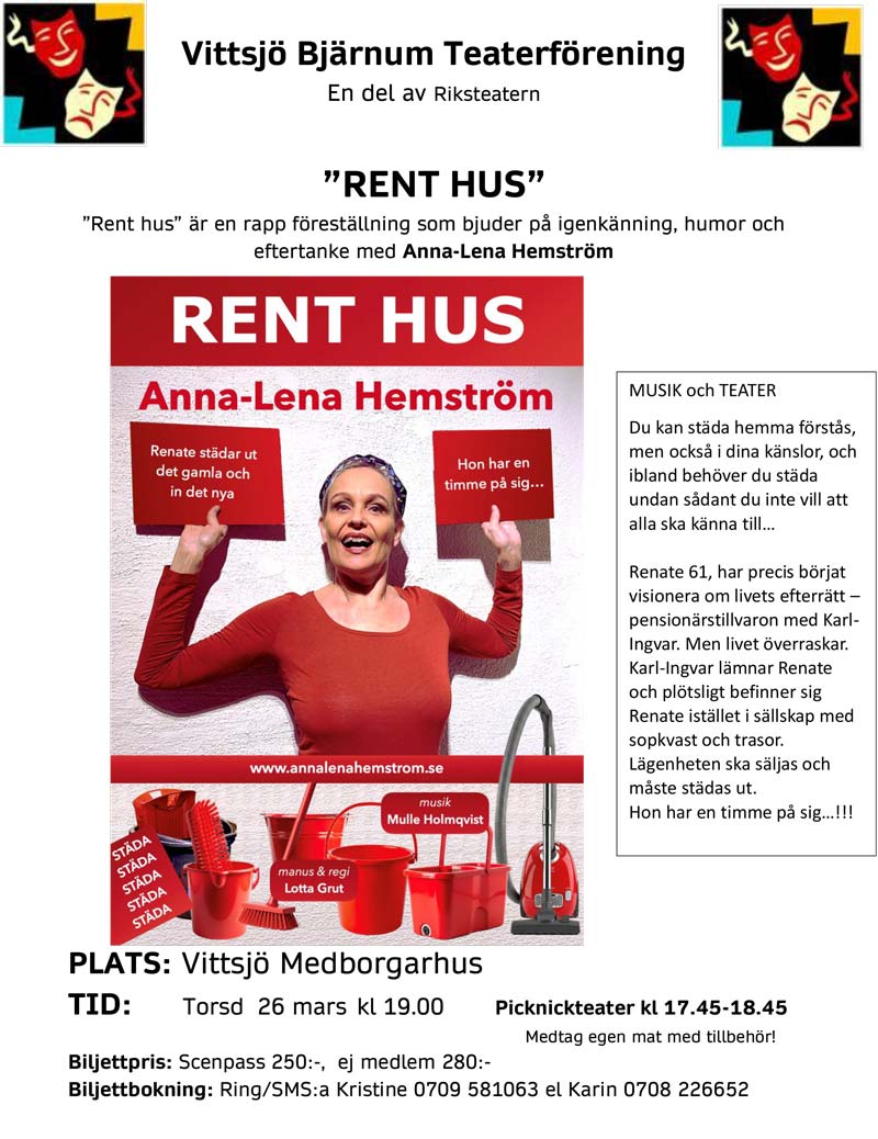 VITTSJÖ. Så var det dags för en utlovad komisk föreställning med namnet "Rent Hus". En parodi som bjuder på igenkänning, humor och eftertanke. Skådespelaren Anna-Lena Hemström bjuder på både städning och känslor i pjäsen.