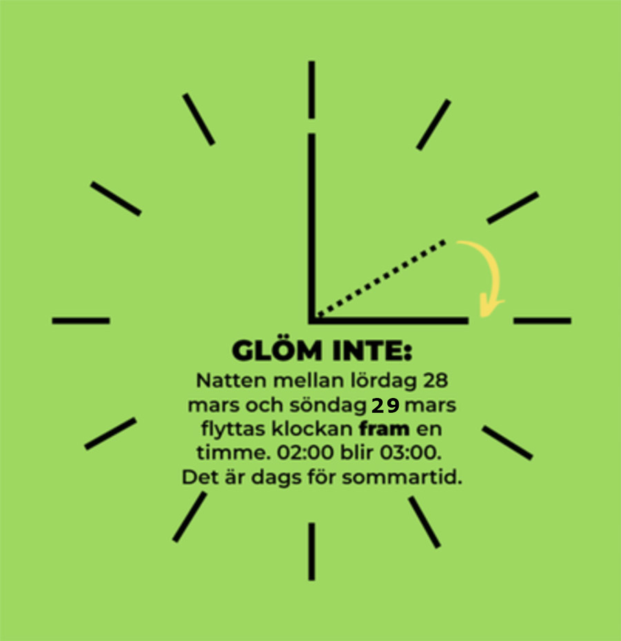 Kommande omställning är till sommartid den 29 mars 2026, och sedan tillbaka till vintertid/ normaltid natten mellan 24-25 oktober 2026.