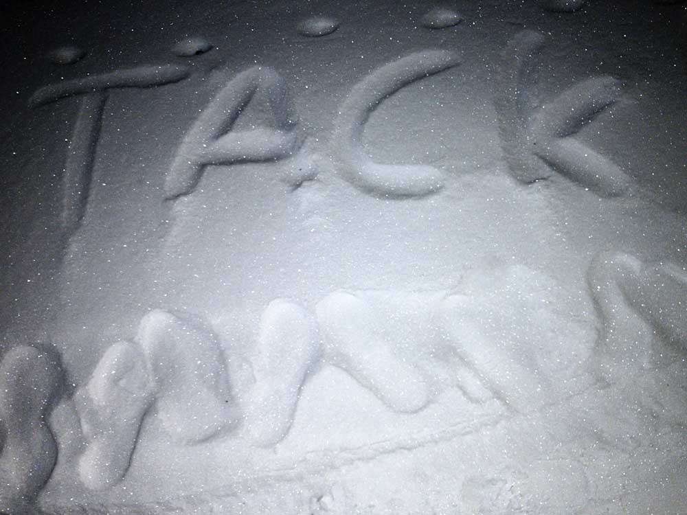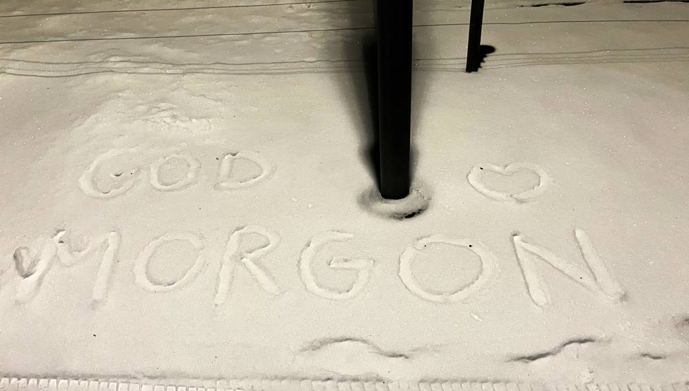 EMMALJUNGA. På promenaden i morse stod en hälsning skriven i snön.