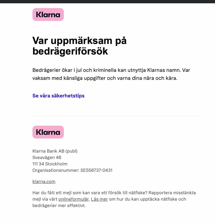 Även seriösa Klarna varnar för berägeriförsök !