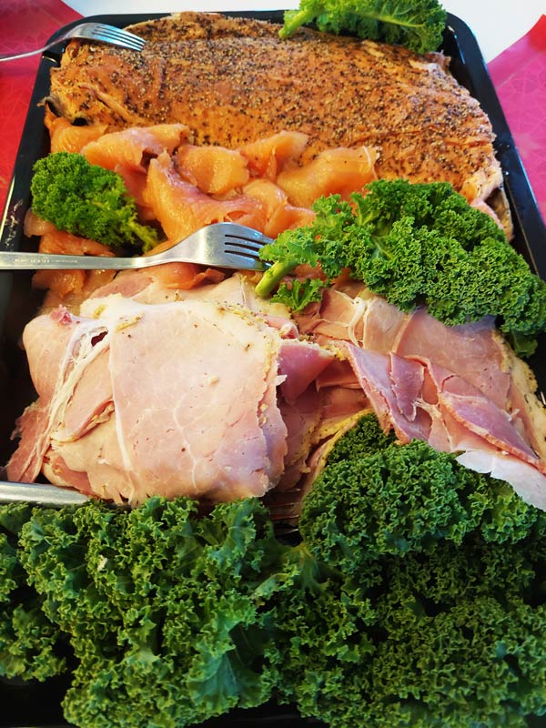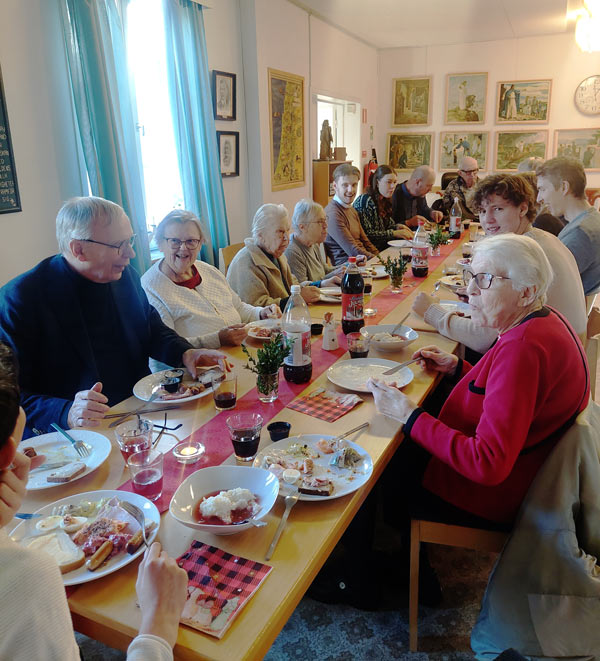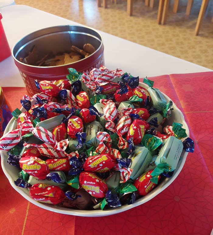 Vi samlades runt det dukade bordet. Här serverades rikligt med julmat och godis, kaffe och pepparkakor.