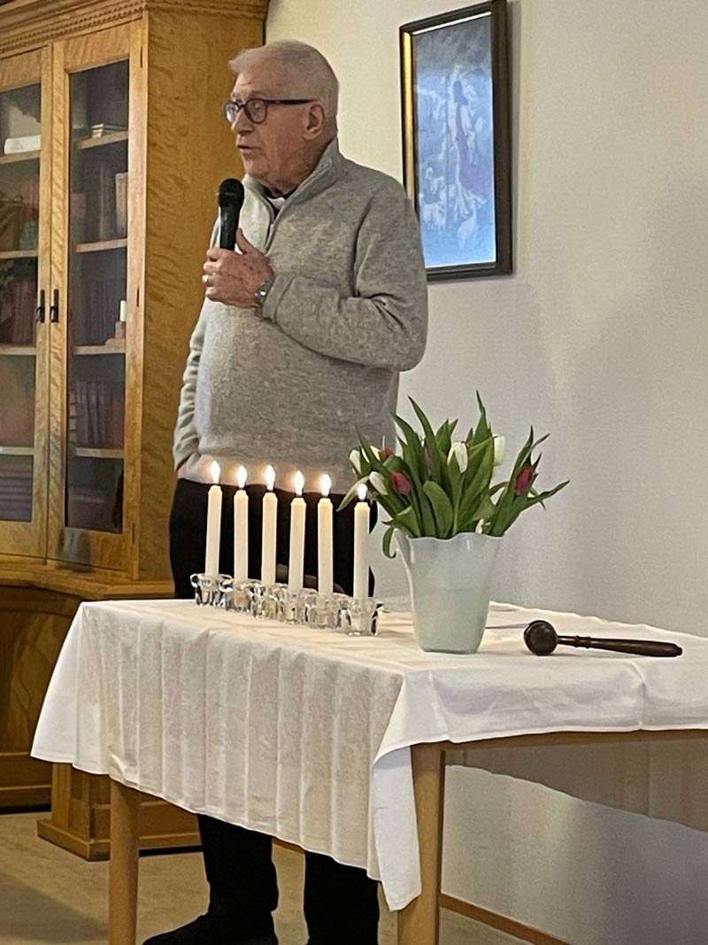 Curre kantor spelade sen “Tro“ av Marie Fredriksson, innan Christer Frostensson höll ett tänkvärt tal om Tro, hopp och Kärlek. Om man får leva länge i en gemenskap, får man ett välfyllt minnesrum, som man kan öppna dörren till och minnas, om det vemodiga händer att någon får lämna. 6 ljus tändes för medlemmar som lämnat oss under 2025, och en tyst minut hölls. Curre spelade sen “Håll mitt hjärta”. En mycket stämningsfull parentation.
