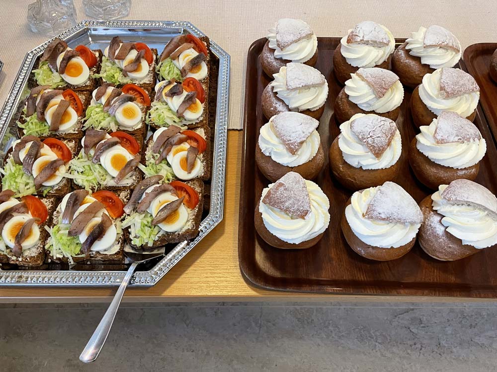 Därefter välkomnades 7 representanter från Länsförsäkringar. De hade olika arbetsområde inom Länsförsäkringar. Fastighetsmäklare, rådgivning, bankärende, försäkringar för nästan allt. På frågan om banken har kontanthantering blev svaret, Nej det har de aldrig haft. Försäljningen av fastigheter ökade 25 % under pandemin, men nu tar det längre tid att sälja. Går man i tankar att sälja sitt hus ska man kontakta mäklare i god tid, det tar tid att planera, bilder ska gärna tas när det är vackrast ute. Om man har hem försäkring, finns ett paket med vattenläckagevarnare och 2 brandvarnare som är kopplat till en app i telefonen, kan beställas på hemsidan. Jan tackar för den intressanta informationen om deras olika arbetsområden, och Pontus tackar för att de fick komma. Och fikat ville de inte missa. Vi tackar Snapphanebygdens sparbank för semlorna.