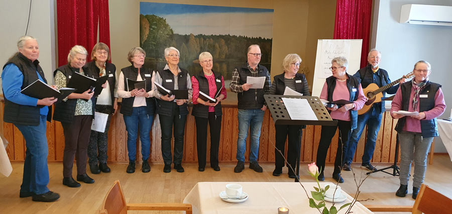 Ett tiotal glada körsångare stämde upp till skönsång under ledning av Peter Nylander. Mycket bra framfört och glädjen hos kören smittade av sig och applåderna rungade. Tack alla i Lockavävskören!