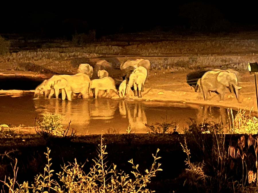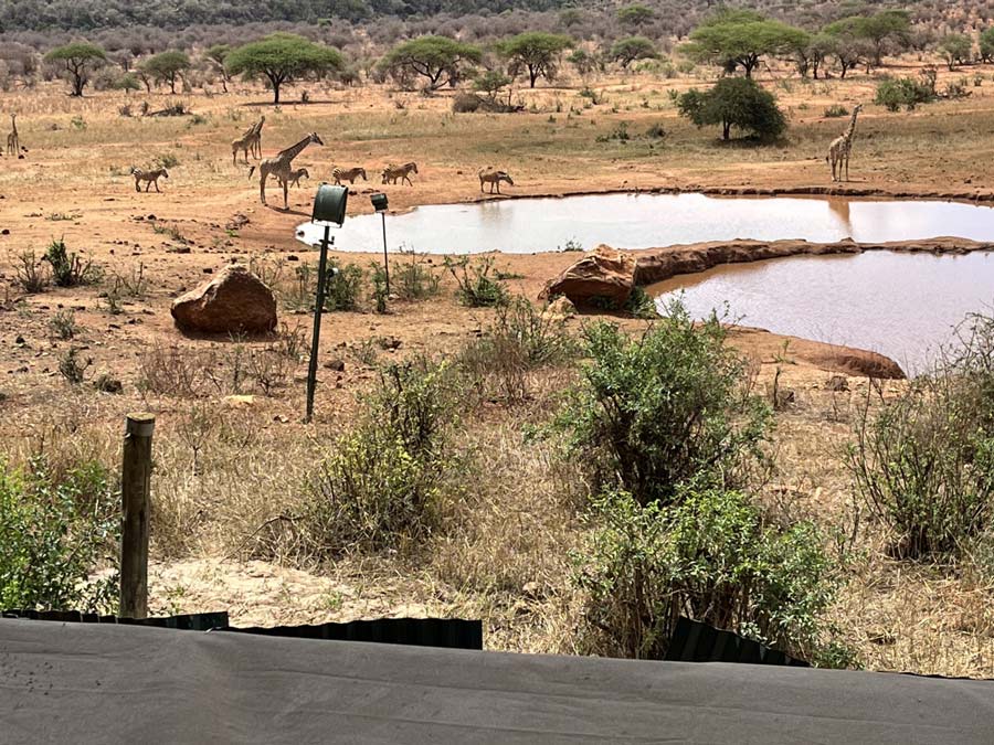 På Kilaguni Serena Safari Lodge gav interiören i matsalen verkligen en exotisk känsla. Då vi sen satt och åt kunde vi samtidigt se ut över ett par stora vattenhål dit djuren kom för att dricka, både på dagen och sent på kvällen.