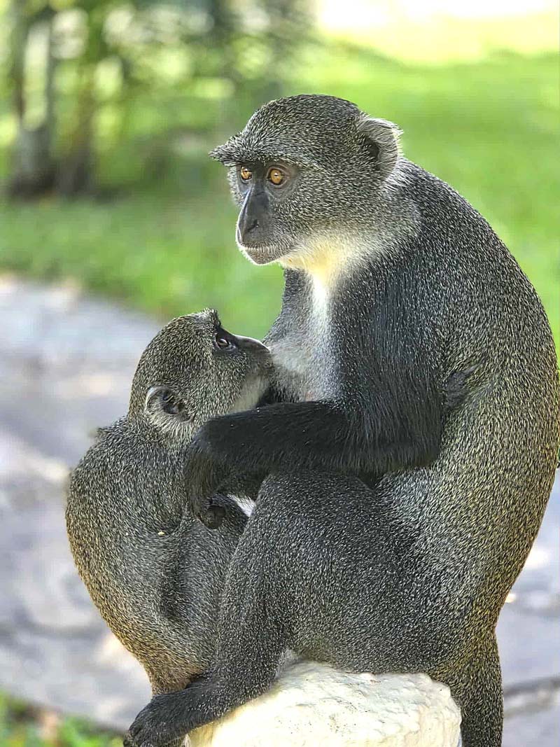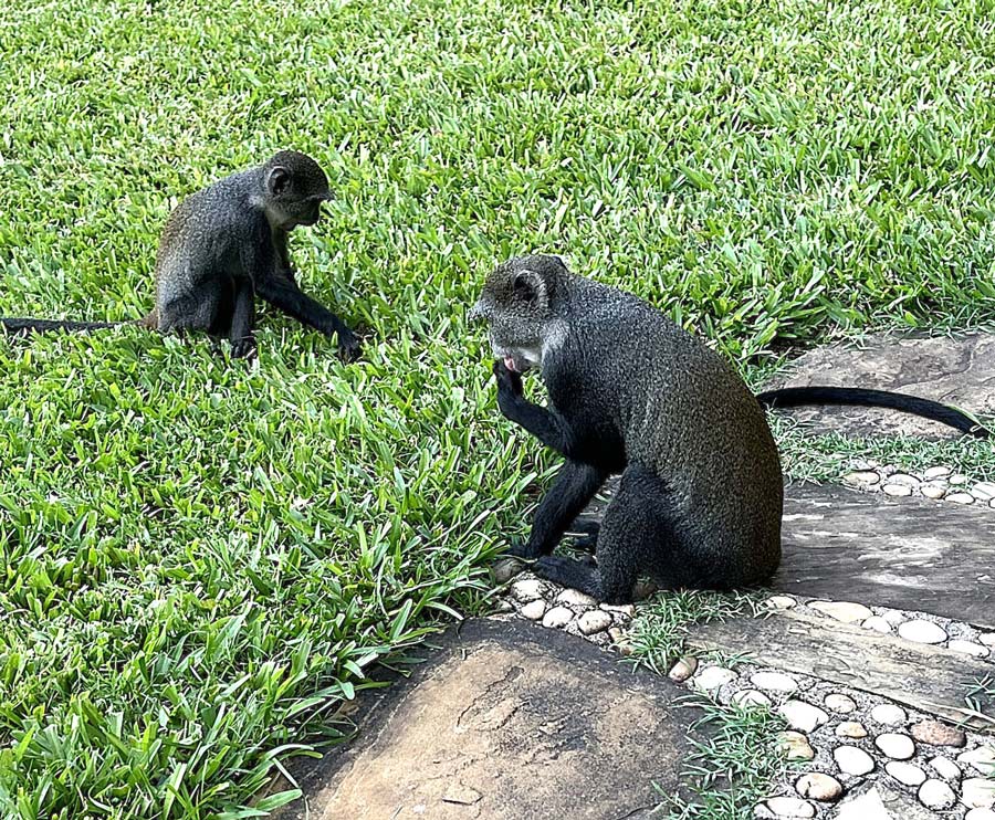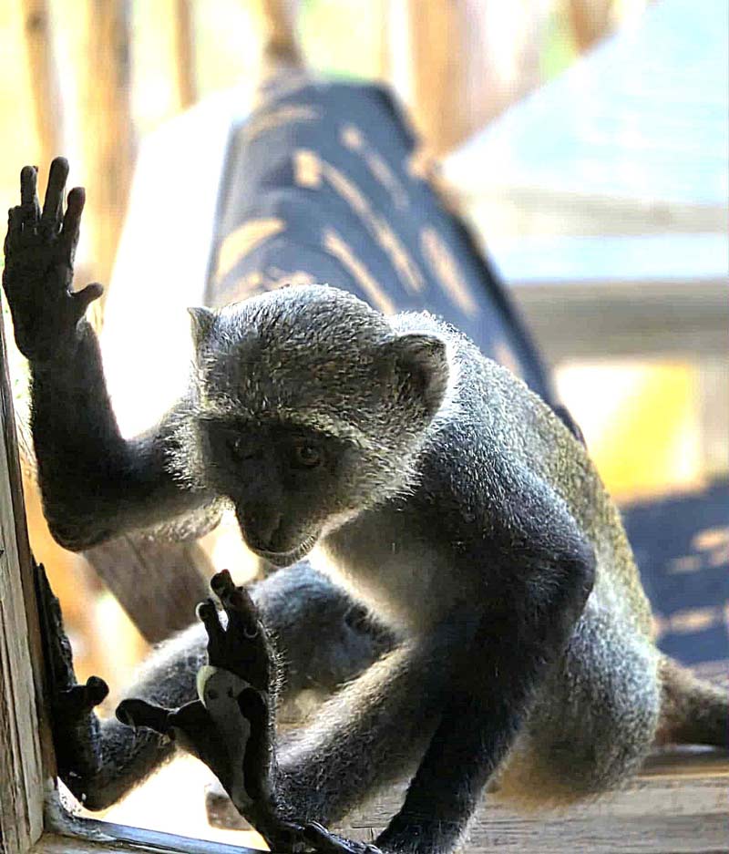 Förutom vi turister bodde det också en mängd apor på lodgerna på gott och ont. De var väldigt söta att se på, särskilt när de minsta lekte runt i gräset, men de kunde också vara besvärliga. De var otroligt nyfikna och framfusiga. Det gick inte att lägga någon frukt eller annat ätbart ifrån sig utomhus, då var där genast en liten apa och nappade åt sig det.