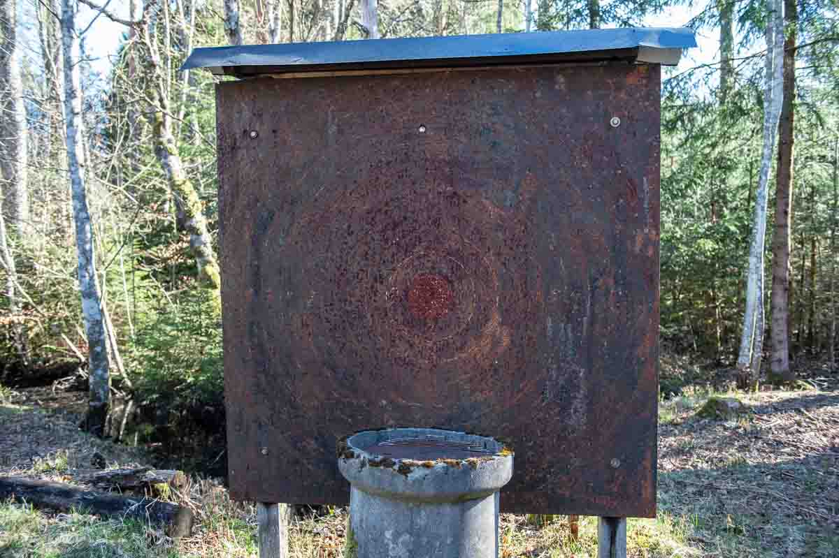 Plåt-tavlan som då skjutbanan fanns vid Pickelsjöns badplats finns bevarad