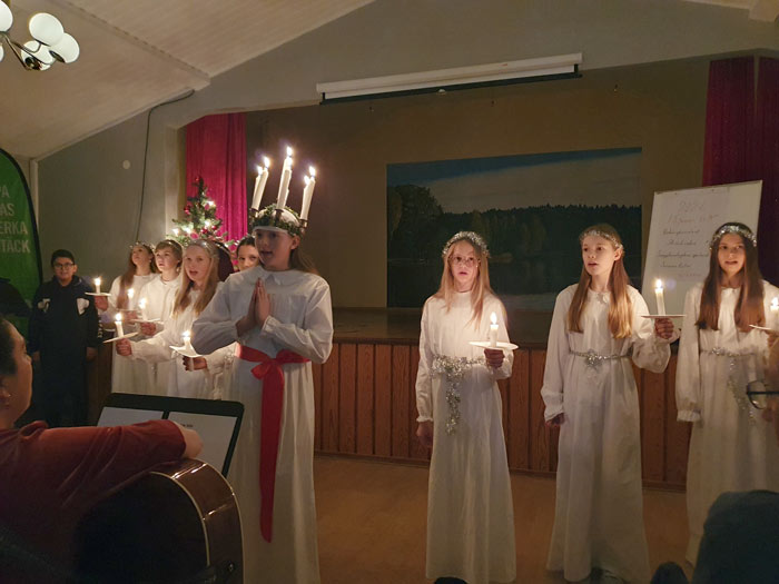 Det var mellanstadie elever från Bjärnums skola som sjöng alla de traditionella luciasångerna och lite julsånger. Tomtar, Rudolf, Stjärngossar och Pepparkaksbagaren fanns med. Vackert, stämningsfullt och väldigt bra gjort. Tack alla duktiga elever och lärare!