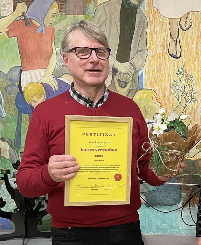 VITTSJÖ. Vid kyrkokörens sångövning den 18 december delade Ewa Wendt, körmedlem, ut certifikatet för Årets Vittsjöbo 2025 till körledare och kantor Mats Lunnergård.