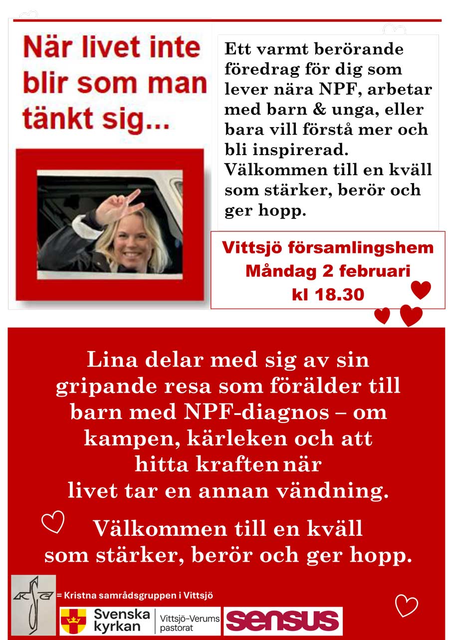 VITTSJÖ. Välkommen till Vittsjö församlingshem måndag 2 februari kl 18.30 Ett varmt berörande föredrag för dig som lever nära NPF, arbetar med barn & unga, eller bara vill förstå mer och bli inspirerad. Välkommen till en kväll som stärker, berör och ger hopp.