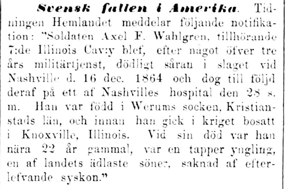 VERUM. I ”Historiskt-geografiskt och statistiskt lexikon öfver Sverige” tryckt 1866 kan man läsa detta om en stupad soldat som var född i Verums socken 1843: Bland märkligare män, utgångna härifrån, torde få räknas soldaten Axel F. Wahlgren som dog vid endast 22 års ålder, den 28 December 1864, af erhållna sår uti slaget vid Nashville i Amerika; om honom heter det, att han var tapper och en af landets ädlaste söner.