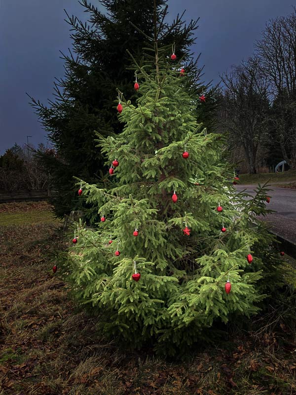 EMMALJUNGA. I år fick vi leta förgäves efter tomtens gran i skogen. Ingenstans såg vi en kulpyntad gran!