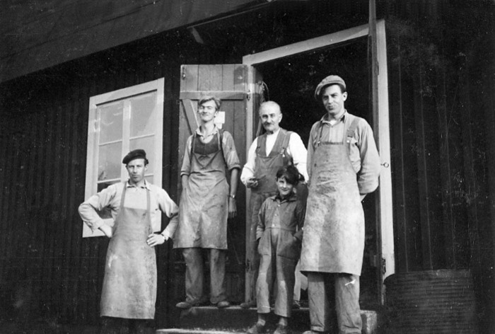 Vid ingången till Enock Nilssons möbelfabrik i Stavshult. Fr. v. Viking Persson, Stig Persson, Enoch Nilsson, Björn Persson och Vilbert Persson. (Enock Nilsson var född i Brogården 1883 av snickaren Nils Sonesson f. 1856 och hustrun Hanna Månsdotter f. 1845. Nils Sonesson drev där en snickeriverkstad som han övertagit efter faderns Nils Olssons död 1880.)