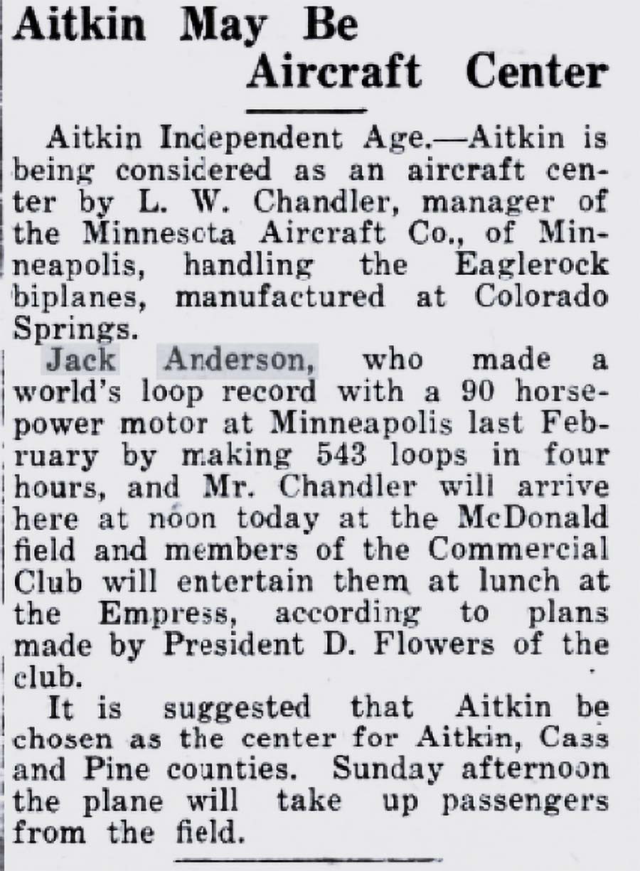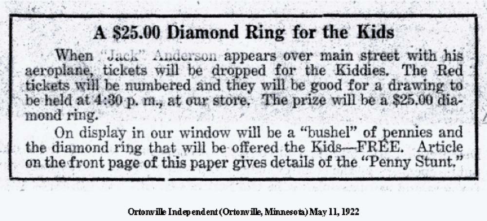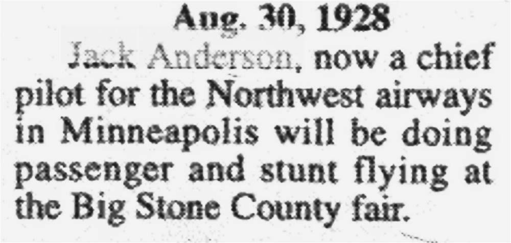 Notis från Ortonville Independent 30 augusti 1928: Jack Anderson, now a chief pilot for the Northwest airways in Minneapolis will be doing passenger and stunt flying (akrobatflygning) at the Big Stone County fair. Jack Anderson hade 1921 varit med vid en uppvisningsolycka. Tidningen Ortonville Independent skriver den 26 maj 1921 under rubriken ”Flygplan skadade vingarna” (utdrag i översättning): Den första flygplansolyckan för flygsäsongen i Ortonville 1921 hände på Mc Niffs fält i torsdags när Gregory B. Uphengeipher, tidigare major i polska armén landade där under i kraftig vind. Efter landningen och sedan han taxat förbi Jack Andersons biplan tog en kastvind planet och kastade det på rygg [...] Piloten Jack Anderson och majoren flög i väg i formation i onsdags. Jack Anderson var på väg till Sioux Falls i South Dakota. [...] ... på fredag ska de två leda en flygkamp. Mr. Anderson ska ha sitt plan dekorerat som ett bolsjevikiskt plan och Major Uphengeiphers plan kommer att bära hans berömda polska insignier.