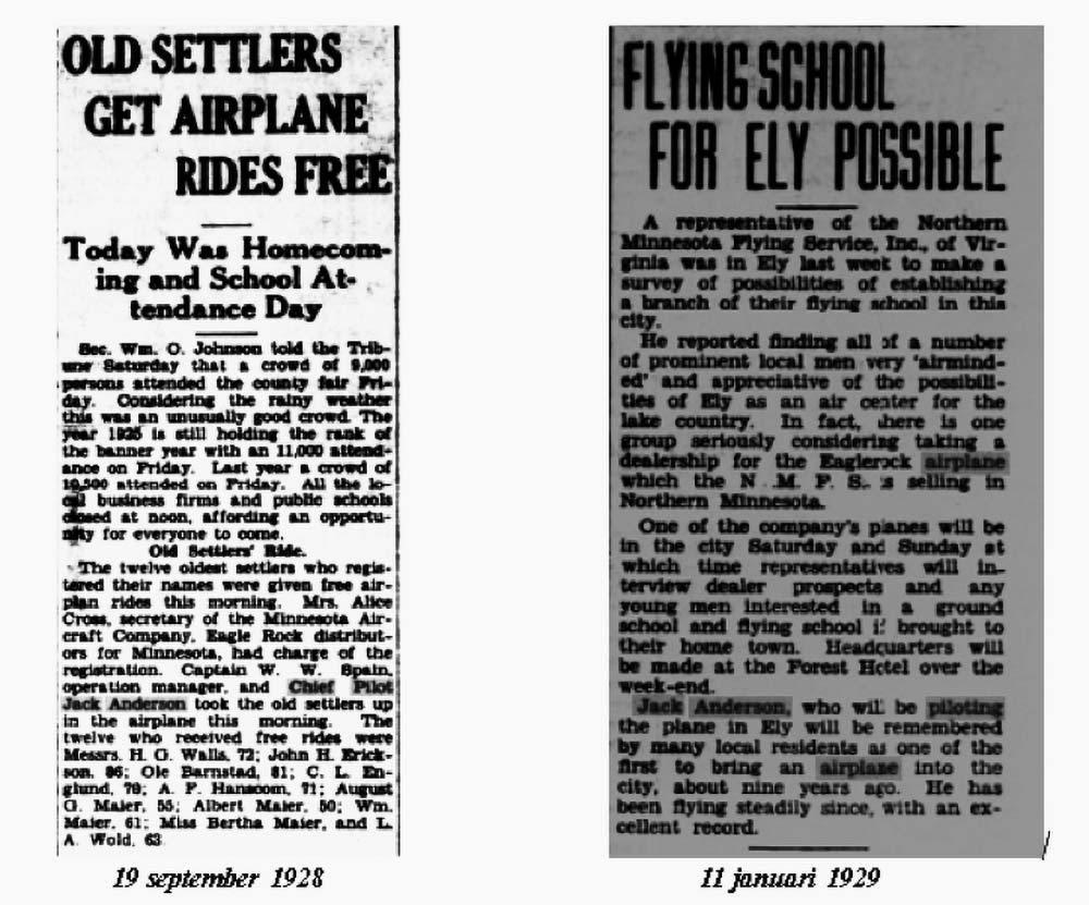 Jack Anderson var tidig med att ägna sig åt flygning. Hösten 1928 förde han som pilot ett flygplan där de tolv äldsta nybyggarna fick en fri flygtur över sina hemtrakter i Big Stone County i Minnesota. I en tidningsartikel från den 11 januari 1929 omtalas hans erfarenheter som flygare: Jack Anderson som skall vara pilot av planet i Ely kommer att minnas av många i lokalbefolkningen som en av de första som tog ett flygplan till staden för omkring nio år sedan. Han har flugit oavbrutet sedan dess med framgång.