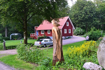 Första stopp var Hishults konsthall. Genom ett sommarfagert landskap kom vi fram till konsthallen som är inrymd i en vacker gul byggnad. Utställning av konst inomhus och skulpturer i den vackra trädgården.