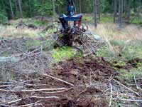 Vi har tillverkat ett markberedningsaggregat av en begagnad harv att användas på griplastare, vid prov ser den ut att göra ett tillfredsställande arbete om terrängen medger framkomlighet, vi tänker göra några försök för att se om resultatet blir det önskade, här är ett par bilder från provningen: